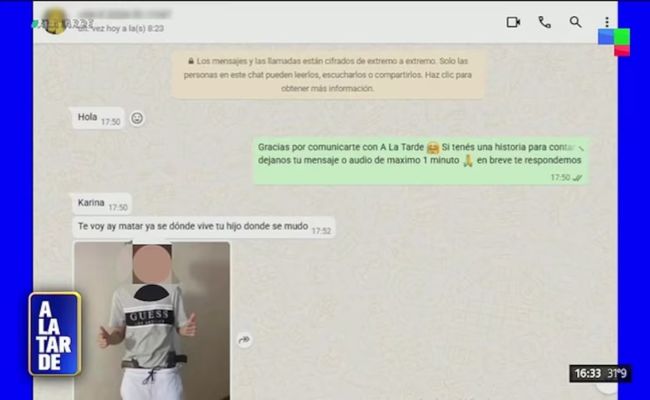 “Karina, te voy a matar. Ya sé dónde vive tu hijo, dónde se mudó”, afirmó la amenaza. En tanto, el emisor compartió una imagen suya con dos pistolas y la frase: “Te la voy a descargar, vas a ver, en la cabeza”.
