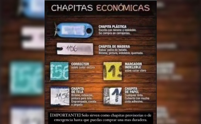 Otra opción es sobre tela o papel cubierto con mucha cinta adhesiva. Los datos, en tanto, pueden registrarse con birome, pintura indeleble o corrector. Éste deberá ajustarse al tipo de color de la base. "Si lo amas identificalo. Toma menos de cinco minutos y le estás salvando al vida a tu compañero", expresan desde la entidad.