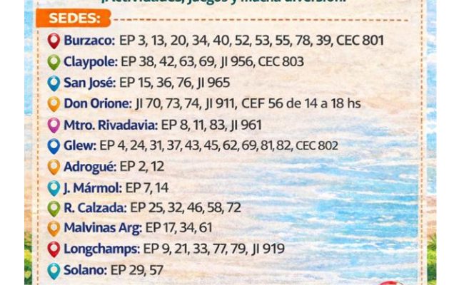 En ese sentido, el Municipio aporta materiales y equipamiento como piletas de lona, artículos de librería y educación física. Además, durante las dos últimas semanas del mes, las sedes visitan alternadamente el Polideportivo de Ministro Rivadavia y el natatorio, para que los chicos realicen actividades acuáticas.
