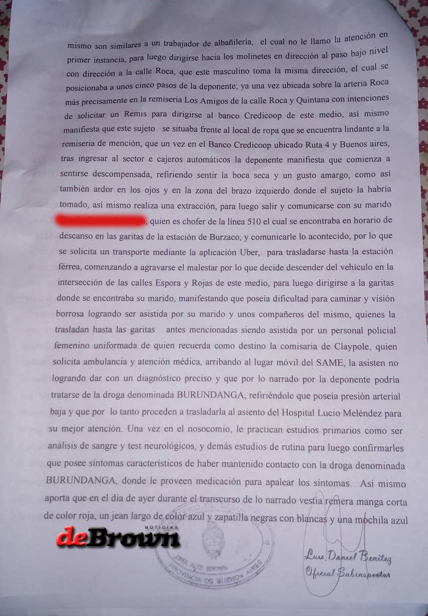 Mariana Inés Gómez, una vecina de Glew, denunció que la drogaron el jueves con la famosa “Burundanga”. Se trata de una sustancia que actúa como depresor de las terminaciones nerviosas y del cerebro, dejando a la víctima en un estado hipnótico.