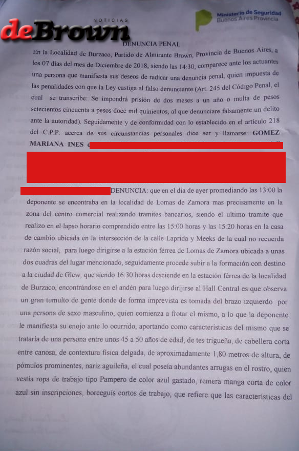 El hecho ocurrió a las 16.30, en el hall de la estación de Burzaco. “Cuando bajo del tren, desde atrás una persona me agarra del brazo y como que me frota fuerte dos veces. Pensé la verdad que era un tocón”, contó Gómez, en diálogo con www.deBrown.com.ar.