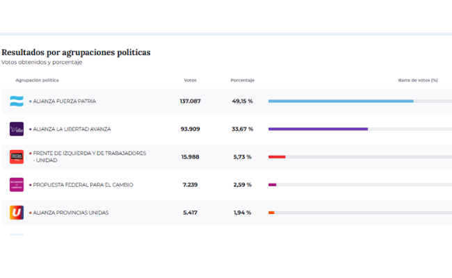 Un escenario totalmente se vivió en la Provincia. La Libertad Avanza obtuvo el 41,53% de los votos; mientras que Fuerza Patria reportó el 40,84%. En tanto, el Frente de Izquierda y de Trabajadores sacó el 5,03%.