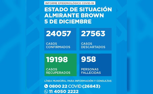 La Secretaría de Salud del Municipio de Almirante Brown informó que al sábado 5 de diciembre de 2020 se registran 24.057 casos positivos de Coronavirus. Estos fueron notificados por las autoridades sanitarias nacionales.