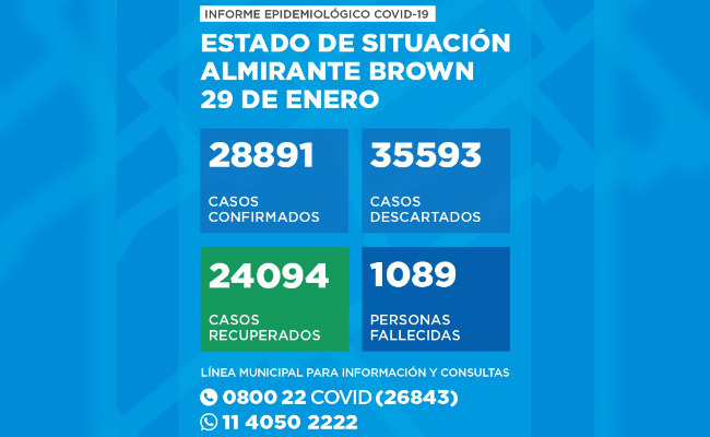 La Secretaría de Salud del Municipio de Almirante Brown informó que al viernes 29 de enero de 2021 se registran 28.891 casos positivos de Coronavirus notificados por las autoridades sanitarias nacionales.
