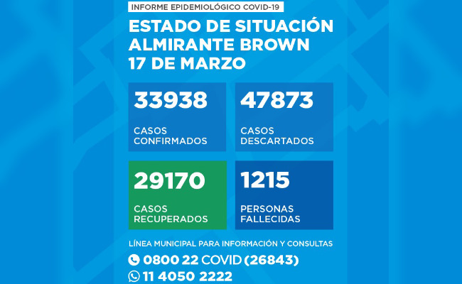La Secretaría de Salud del Municipio de Almirante Brown informó que al miércoles 17 de marzo de 2021 se registraban 33.938 casos positivos de Coronavirus notificados por las autoridades sanitarias nacionales.