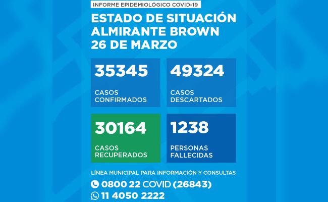 La Secretaría de Salud del Municipio de Almirante Brown informó que al viernes 26 de marzo de 2021 se registraban 35.345 casos positivos de Coronavirus notificados por las autoridades sanitarias nacionales.