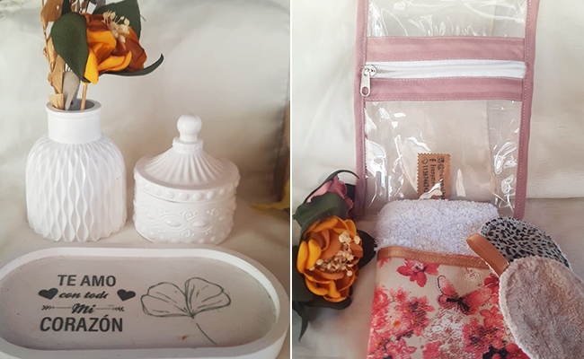 En tanto, "Franymel" venderá un kit deco que contiene florero, alhajero y bandeja con bouquet floral a $20 mil, además de un estuche con cierre para la limpieza facial a $15 mil. Este último tiene una toalla de rostro y 2 pads desmaquillantes.