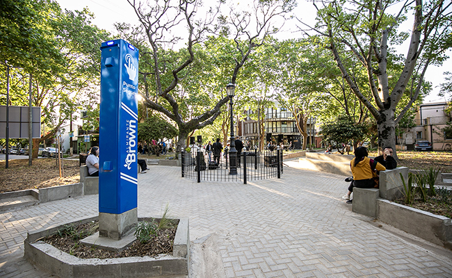 Fue en el espacio público ubicado en el cruce de Diagonal Brown y La Rosa. Se concretó bajo el concepto de “terrazas verdes”, en el cual se aprovechó la estructura arbórea para generar sectores elevados con mesas destinadas al uso gastronómico.
